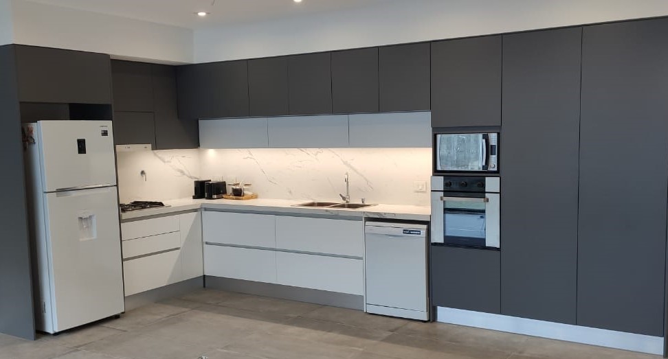 Gabinetes melamina MDP blanca 18mm. Frentes melamina MDP 18 mm según catálogo de colores, con cantos en PVC 0,45. Moldura metálica integrada al gabinete. Precio A Medida.