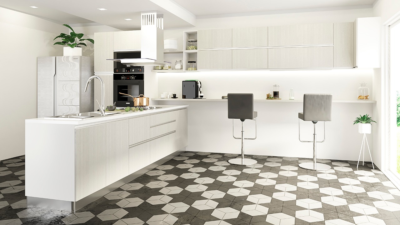 Gabinetes melamina MDP blanca 18 mm. Frentes melamina MDP 18 mm, según catálogo de colores, con cantos en PVC 0,45 y manija perfil aluminio tipo «C» incorporada. Utilizamos para todas las línea de productos cantos de PVC 0.45mm, sea en gabinetes o frentes. Bisagras de 35 mm con cierre suave. Precio A Medida.